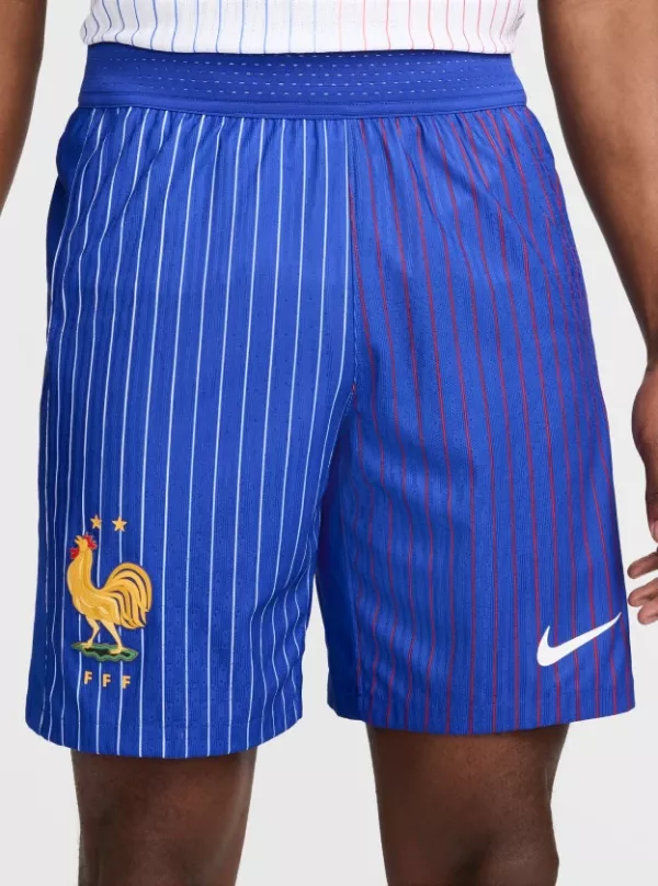 Deux modèles de shorts viennent compléter la tenue : une version blanche avec un liseré tricolore au-dessus du genou, ou une version bleue reprenant les rayures du maillot, blanches et rouges cette fois.