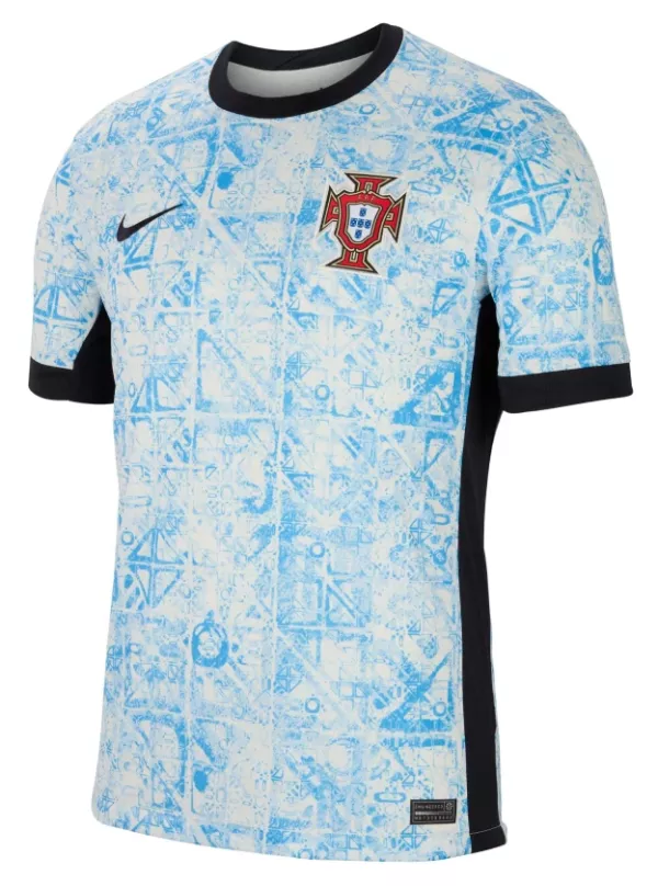 La tenue extérieure tranche radicalement, se parant d’une mosaïque bleue rappelant les célèbres carreaux azulejos. Celle-ci dissimule différents détails symbolisant le lien et la solidarité de la sélection qui a tant fait vibrer les Portugais, champions d’Europe en 2016 après une victoire mémorable face aux Bleus.