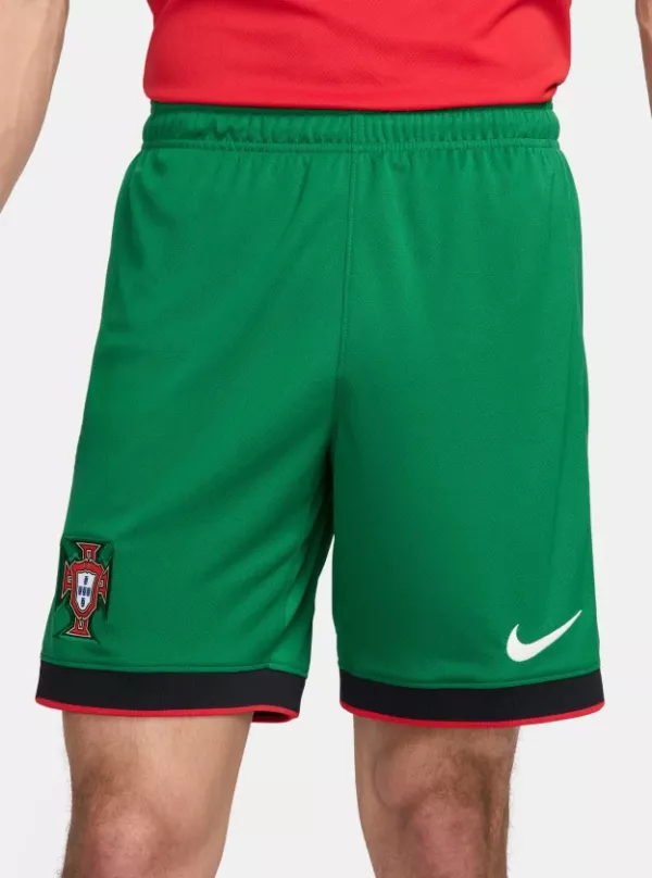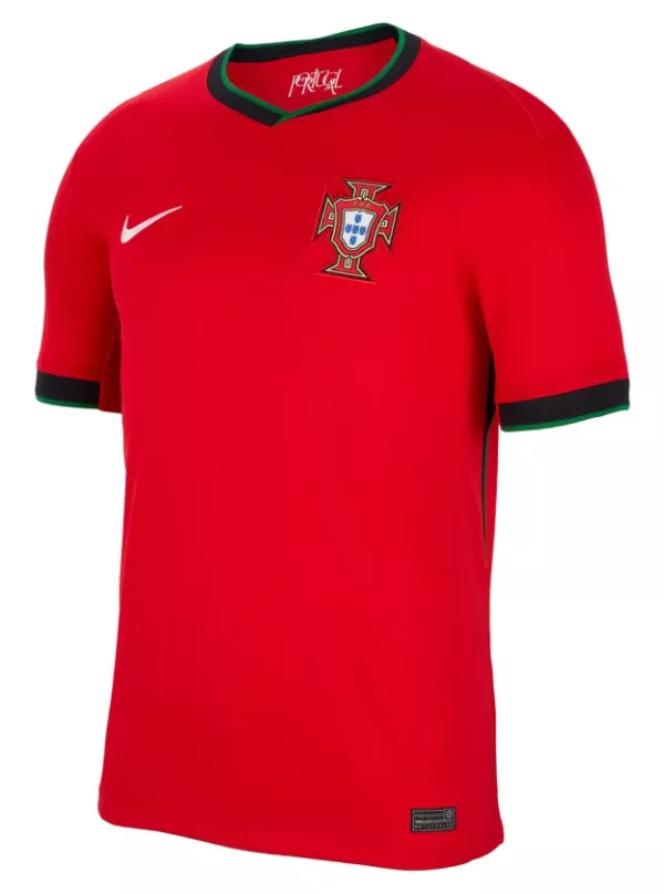 Conçue de la même façon que la tenue tricolore, la nouvelle tunique portugaise se décline elle-aussi en deux versions : domicile et extérieure. La première rend hommage à la couleur du drapeau portugais, avec sa teinte rouge unie ponctuée d’éléments verts, qui en ont fait une des tenues les plus identifiables de l’histoire du foot. Le logo de la fédération portugaise de football est fièrement arboré côté cœur, comme ce fut le cas depuis de nombreuses années par les légendes de la sélection : Eusebio, Luis Figo ou encore Cristiano Ronaldo.