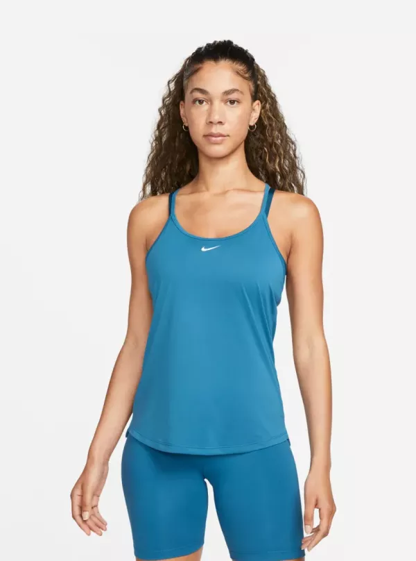 Du côté de chez Nike, on retrouve le débardeur femme W NK ONE DF ELSTKA STD TANK Bleu composé à 100 % de fibres de polyester recyclé.